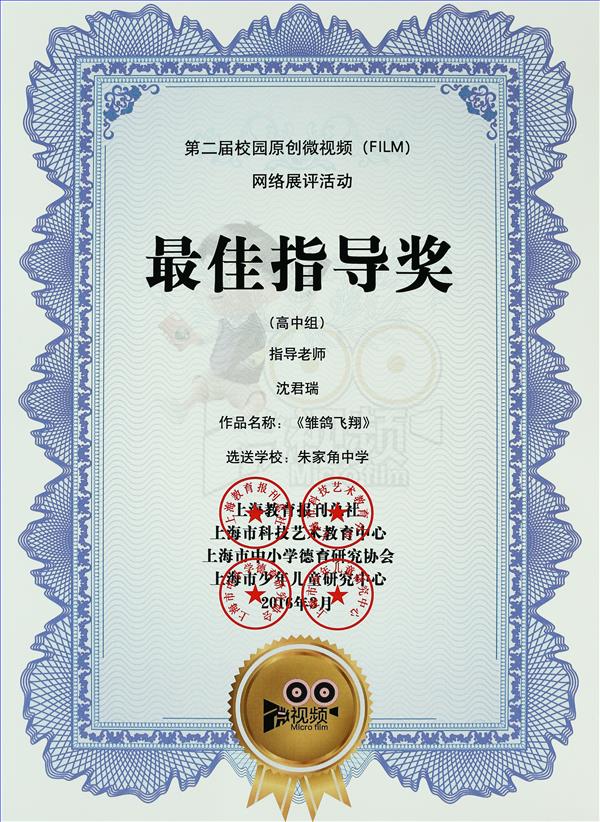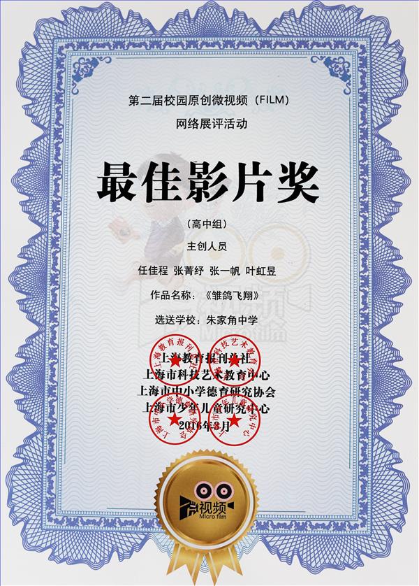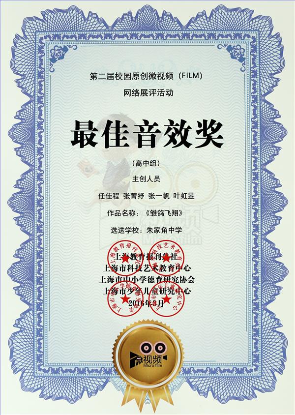 热烈祝贺我校微电影社选送的短片《雏鸽飞翔》在第二届校园原创微视频(FILM)网络展评活动中,荣获最佳影片奖、最佳音效奖、最佳指导奖。我校荣获优秀组织奖。