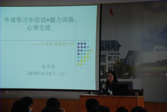 4月8日,学校邀请我校毕业生、现就读于上海外国语大学的索菲娅和冯泽洲同学来校做学习交流讲座。