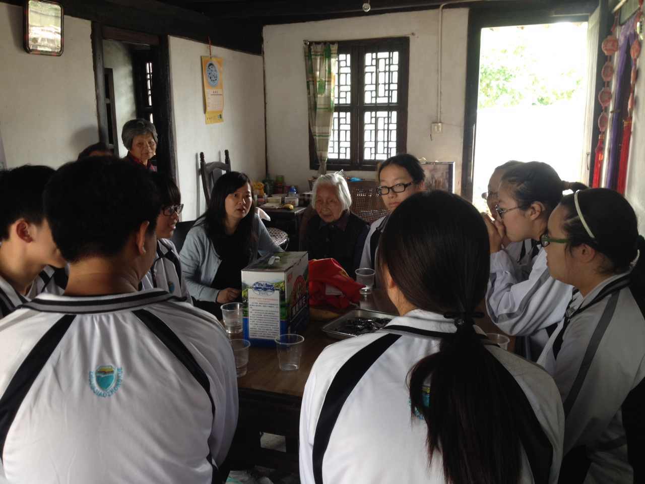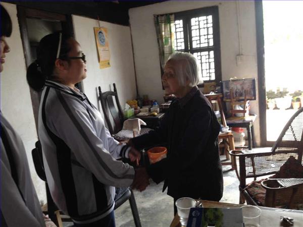 2016年5月24日,天气一改前几天的阴雨,阳光十分明媚。学校组织同学们一起去了朱家角古镇看望一名93岁高龄的老太太。在老师的带领下,我们来到了老太太之家。开门的是一位满头银发的老奶奶,满头的银丝和头上深深的皱纹显示出她所经历的沧桑,但她的声音很明亮。她热枕地邀请我们进屋。那是一间有着百多年历史的老屋,屋子并不大,但收拾的很整洁,床上的被子叠地整整齐齐,桌子上的物品也摆放的井井有条。奶奶已经九十多岁了,但身体仍是很硬朗,热情地招呼着我们喝水、吃糖。我们愉快又轻松地聊着天,又为奶奶齐声高歌一曲,嘹亮的歌声郎朗从屋子传出,一直传进了老奶奶的心里。时间过得很快,转眼间就到与奶奶道别的时候了,我们每人都真诚地送上了对奶奶的祝愿,她热情依旧地与我们一一道别。看着她的身影站在门口送别,我心内不由一阵感慨。