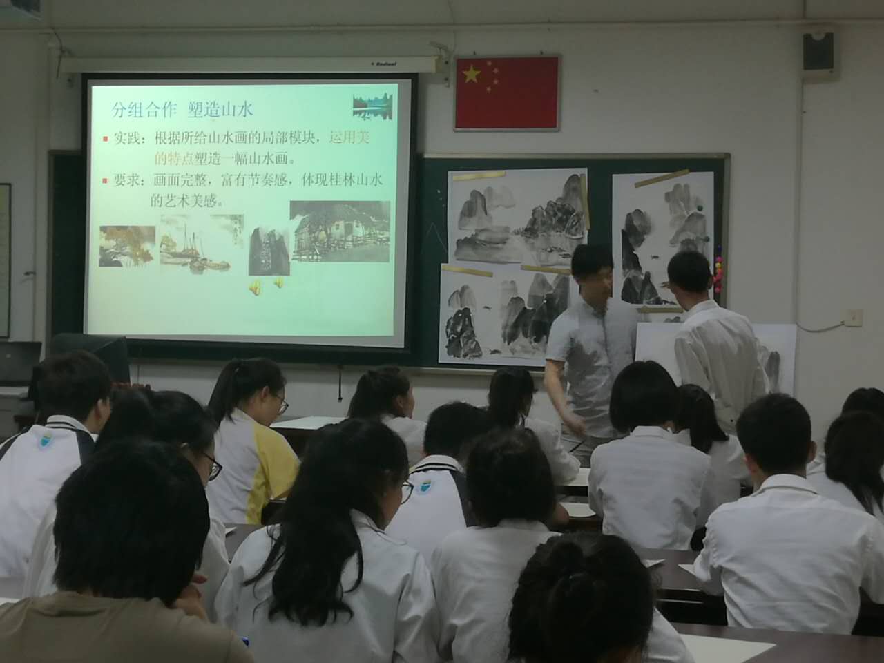 活动首先观摩了由朱家角中学冯蓓蓓老师执教的《又见刘三姐》和伍邦军老师执教《桂林山水的艺术美----听民歌塑山水》两节课。两节课分别从音乐、美术不同背景进行同课异构。冯老师以学生艺术实践为基础,通过对不同时期表现“歌仙刘三姐”的作品进行赏析,在实践的基础上延伸性地引导学生多元的欣赏整部作品的艺术性,以感知、实践、探究等方式,通过学习和欣赏更加全面、立体的理解广西民族音乐文化,理解民族文化艺术作品创作的价值。青浦二中伍邦军老师执教《桂林山水的艺术美----听民歌塑山水》,则通过视频、图片欣赏、绘画作品赏析、学生自主学习、小组讨论等形式,从不同角度感受桂林山水的艺术美感及艺术家的情感表达,体验桂林山水画创作的乐趣,增强学生对祖国大好河山热爱之情感受桂林山水的艺术魅力。