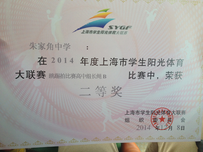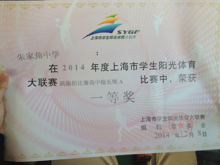 我校高一(7)班顾书屹、金逸、张亦城、施曾天、蔡郁雯、徐佳怡、陆静、吴悦、郑史凡、杨诗雨、张伊凡、朱智磊、马雨洋组成的朱家角中学踢跳队代表青浦区参加“上海市学生阳光体育大联赛跳踢拍比赛中”,荣获高中组