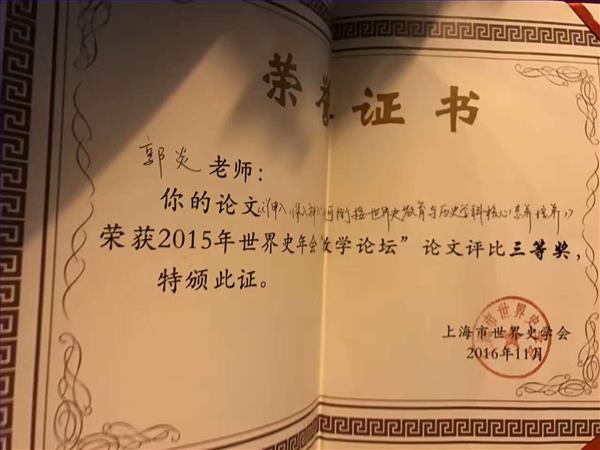 2016年11月6日,上海市世界史学会三十周年纪念大会暨2016年学术会及青年论坛在华东师范大学闵行校区举行。本次大会诚邀来自上海市高校和科研院所以及中学的世界史、国际关系等领域的学者、中学教师参会。共同探讨世界史研究的新领域、新思路、新方法、新突破,展示世界史研究和教学的最新成果。我校沈清波老师和郭炎老师应邀出席发言,郭老师的论文被评为三等奖。在世界史教育与历史核心素养培育的论坛中,沈清波和郭炎老师分别就《在黑非洲教学中尝试示范、模仿和迁移》以及《伸入-深入-神入,如何衔接世界史教育与历史学科核心素养培养》作了大会发言。在互动环节特级教师、大学教授进行了精彩点评。本次活动有效提升了中学教师的史才、史学、史识和史德。在与专家学者的交流中引领我们向着更高的领域攀登。
