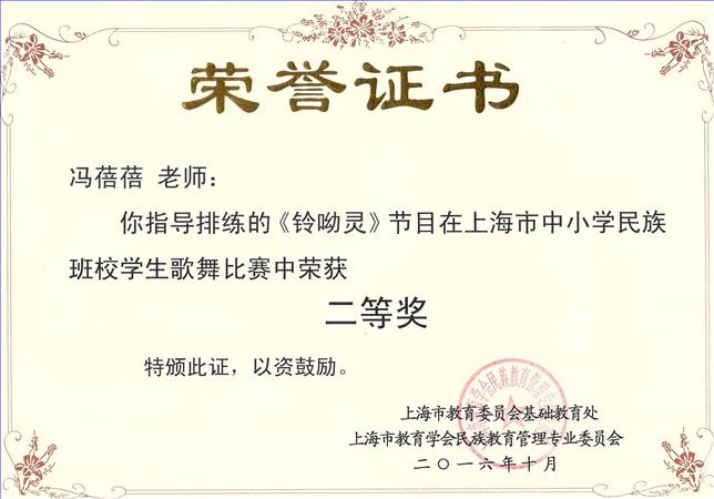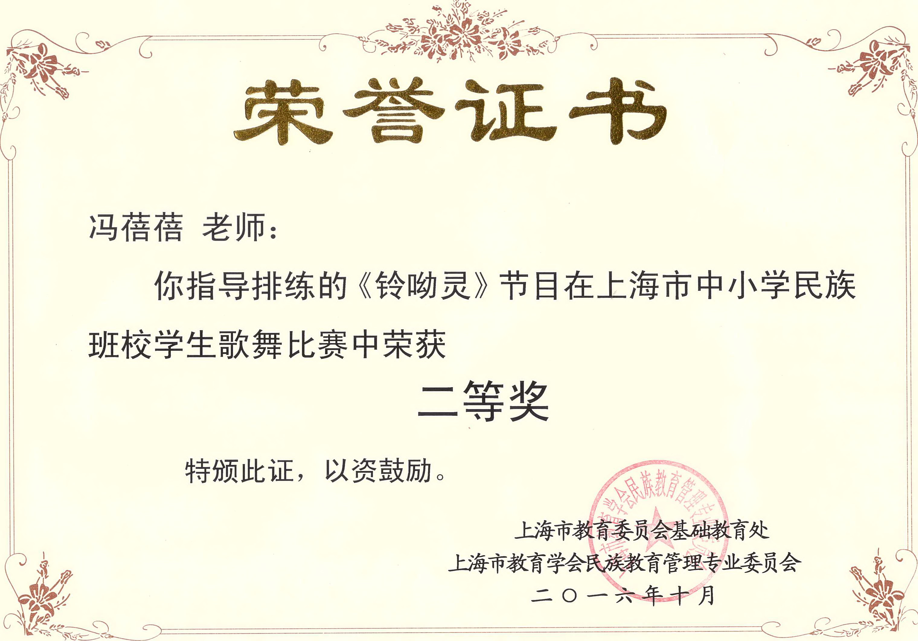 日前,冯蓓蓓老师指导、新疆部学生表演的舞蹈《铃呦灵》参加由上海市教育委员会基础教育处、上海市教育学会民族教育管理专业委员会主办的上海市中小学民族班校学生歌舞比赛荣获二等奖。特此祝贺!