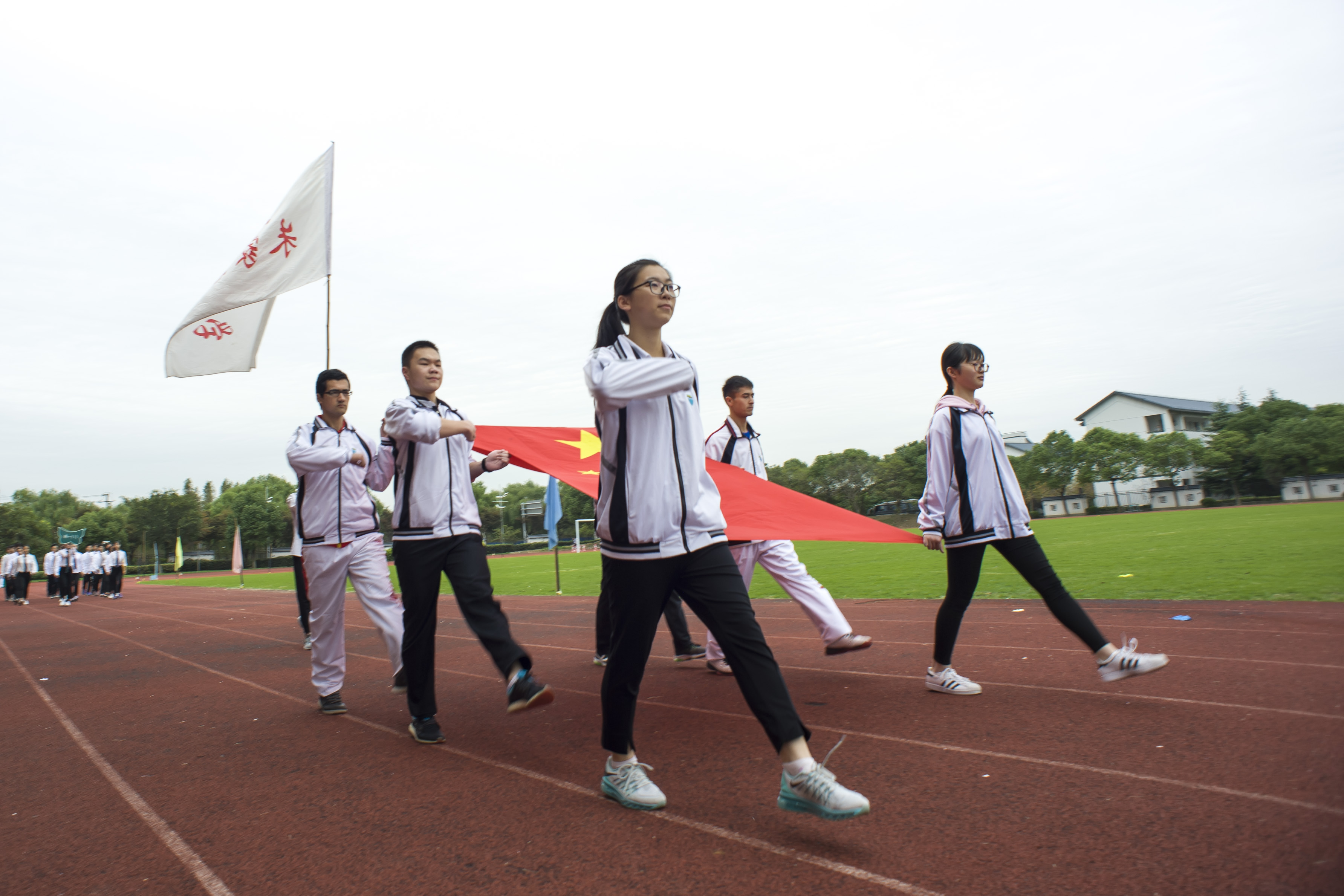 首先进行了丰富多彩的入场式。每个班级精心准备的入场式的表演为全校师生带来了美的盛宴。在全体运动员入场以后,全体师生在五星红旗冉冉升起时唱起了雄壮的国歌。接着校长作了热情洋溢的开幕词。运动员代表表达了全体运动员参加比赛的高昂热情,之后高一学生为我们奉献了整齐划一、充满活力的集体操,紧接着新疆班的学生为运动会带来了具有民族特色的新疆舞蹈,让我们领略了天山脚下特有的风情。运动会以体现团结和作的旱龙舟开始,经过一天半的紧张激烈的比赛,最终以振奋人心的4*100米接力完成了所有的比赛项目。最后,进行了颁奖仪式。