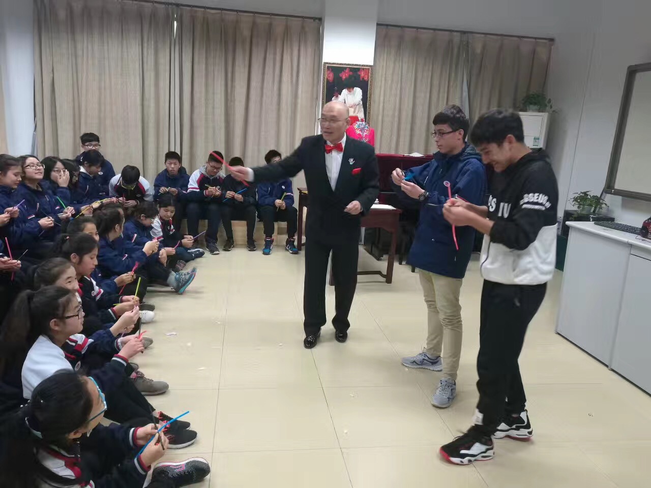 原本是在两根交叉缠绕的吸管被瞬间分开,“哇!真神奇!”“老师,快教我们吧!”讲台底下的同学们睁大了眼,惊叹的同时热烈的掌声响起来。没错,这正是今天艺术课堂上的一幕。这场魔术进课堂的活动,是由镇文体中心特别邀请上海市非物质文化遗产“莫派魔术”第四代传人,送艺进教室边演现教,即为朱中学子带来奇妙的魔术之旅,也给朱中创意艺术课堂增添一抹亮色。