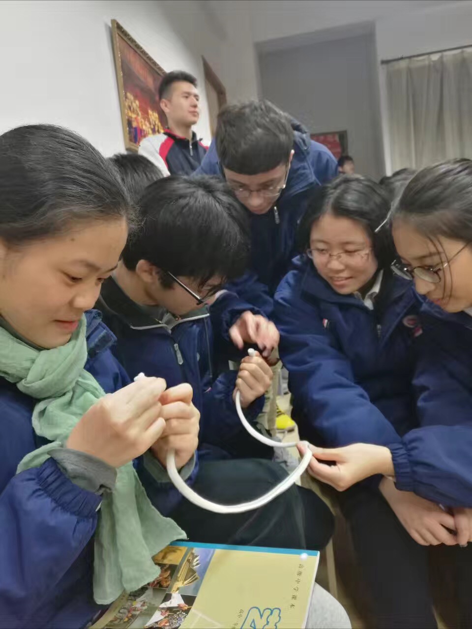 莫老师首先从魔术的理论导入,详细讲解“魔术”两个字的中文由来。接着魔术师为同学们带来了“铁环套链”、“魔术绳”、“心灵感应”等小魔术,同学们仔细观看着每一个动作,努力猜测着个中玄机。一个个意想不到的“惊喜”让学生们大为惊叹,纷纷鼓掌叫好。最后,莫老师还带领同学们学习了“吸管脱扣”,经过耐心的讲解和一遍遍的示范,大多数同学都能独立完成。短短的四十分钟让到场的同学们依依不舍,活动结束后还围着摆弄道具,寻找魔术的破绽。