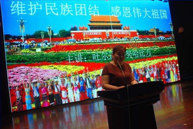 首先,内派教师吐尔逊汗·努哈比力作了“维护民族团结,感恩伟大祖国”的主题讲座。讲座中,吐老师回顾了在我校这一年来的工作,讲述了发生在身边的民族团结典型事例,号召大家维护民族团结,珍惜来之不易的学习机会。