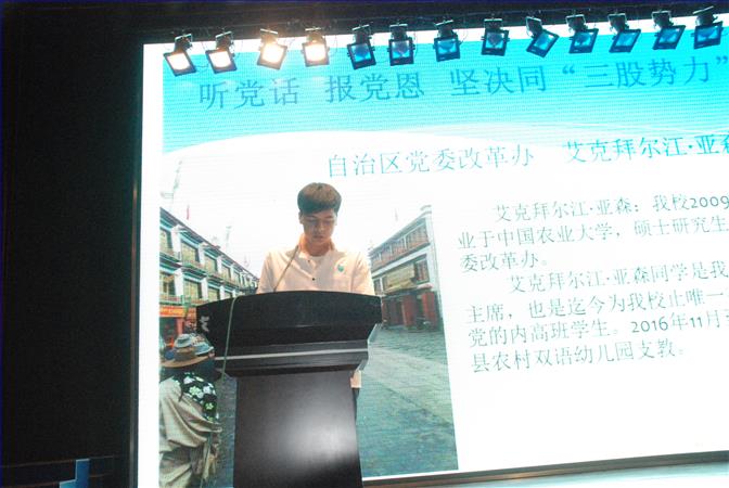 接着由高二13班的阿卜杜吾普尔·纳斯尔宣讲了我校毕业生艾克拜尔江·亚森和努尔麦麦提·多力坤在工作岗位上走村访户、为民办事,将党的惠民政策送到千家万户的先进事迹。