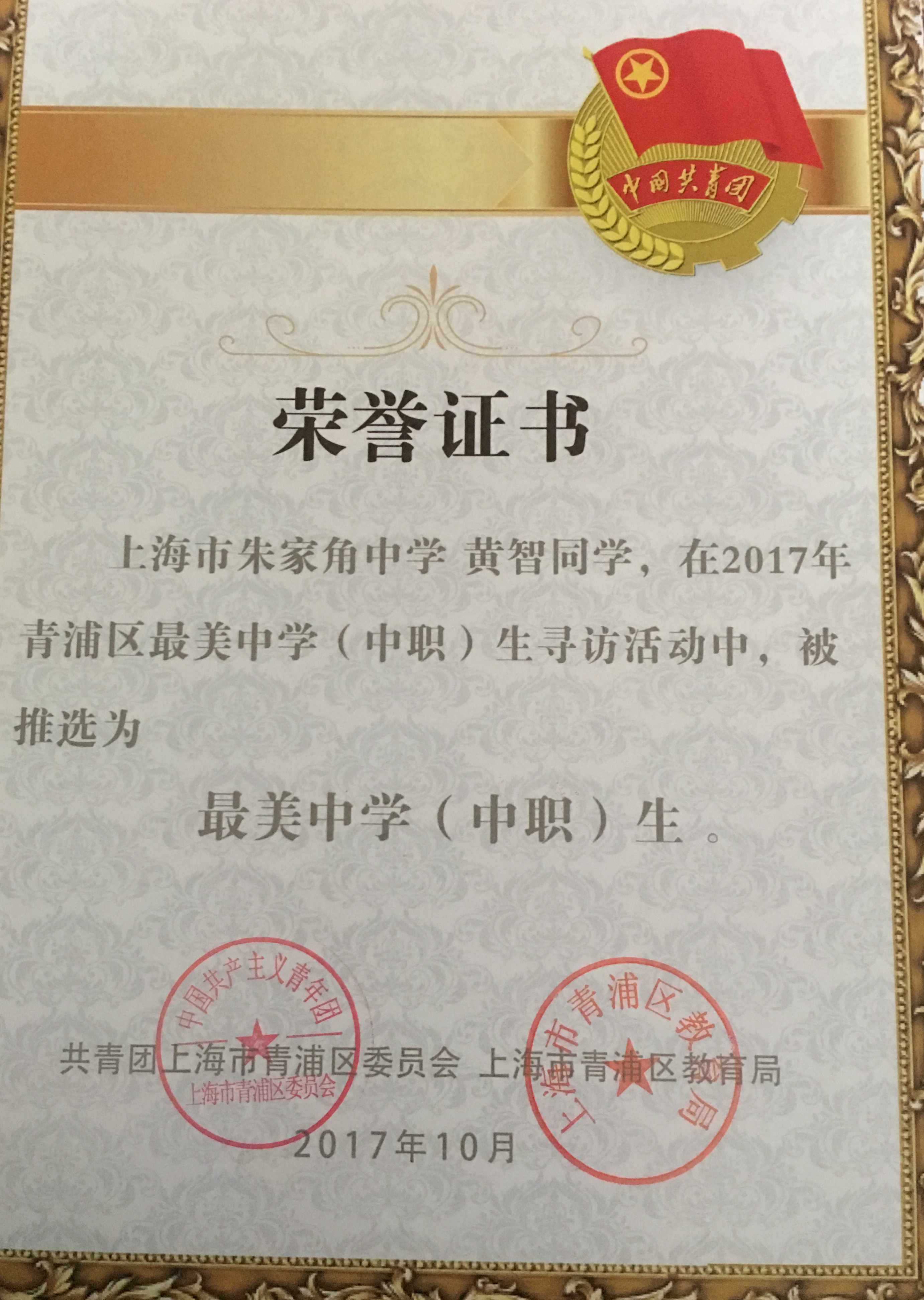 热烈祝贺我校黄智同学荣获2017年青浦区最美中学生荣誉称号!