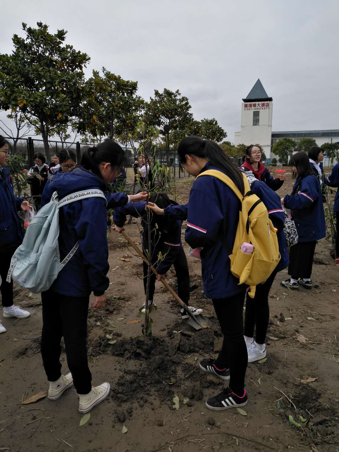 在辅导园区工作人员的指挥下,同学们小心翼翼地将幼苗放进挖好的坑里。女同学开始培土。有的同学默背《种树郭橐驼传》中的种树方法,很快就完成了种植。