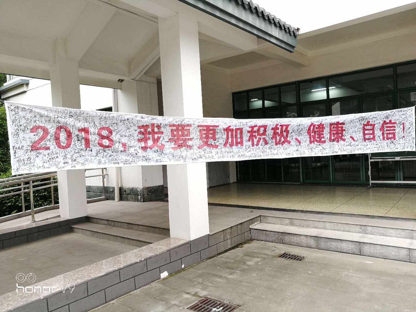 5月28日,学校政教处、团委、心理辅导室、学生会在学校食堂门口联合举行了“2018,我要更加积极、健康、自信”心理健康宣言现场签名会活动。全校师生积极参与,健康宣言的横幅上签满了学生和老师的姓名。签名活动后,横幅悬挂于食堂门前。在路过食堂门口时,许多同学会驻足横幅前,诵读健康宣言。相信在健康的心理氛围中,学生们的心态会更加积极、健康、向上。