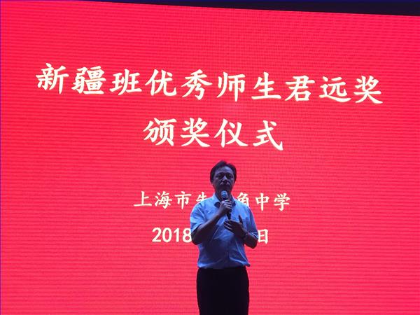 6月9日,学校在夏虹楼音乐厅隆重举行新疆班优秀师生君远奖颁奖仪式暨2018届毕业生欢送会。上海唐君远教育基金会秘书长金同康先生、我校校长蒋伟勇老师、校党支部副书记兼新疆部分管领导谢建妹老师及全体新疆部师生出席活动。
