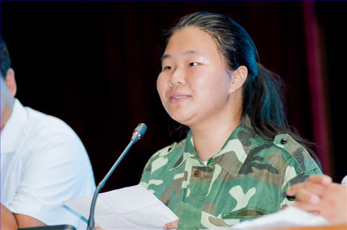 高一(1)班高智怡同学代表全体新生发言,她认为军训是他们新学期的第一堂课,她号召同学们发扬不怕苦、不怕累的精神,在拼搏中体验人生、品味成功。