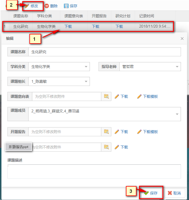 八、如需修改,按下图步骤,先点击保存的课题,然后点击修改,最后点击保存即可