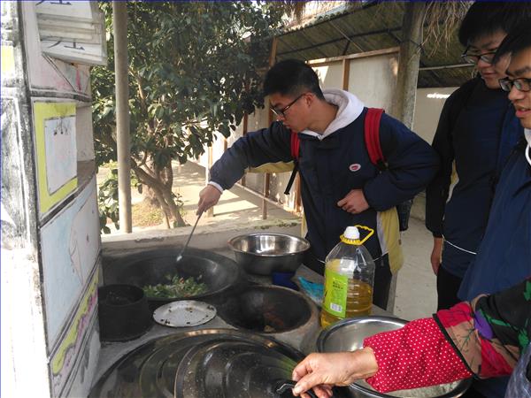 而本次活动的独家体验即是生火,开始时同学们面对生疏的木柴手足无措,接着有同学主动向指导老师讨教,然后运用课堂所学的化学知识,让木柴燃烧时与氧气充分接触。终于,灶火燃起来了,大锅饭煮起来了。小厨房里,流水声、切菜声、锅铲声、欢笑声此起彼伏……