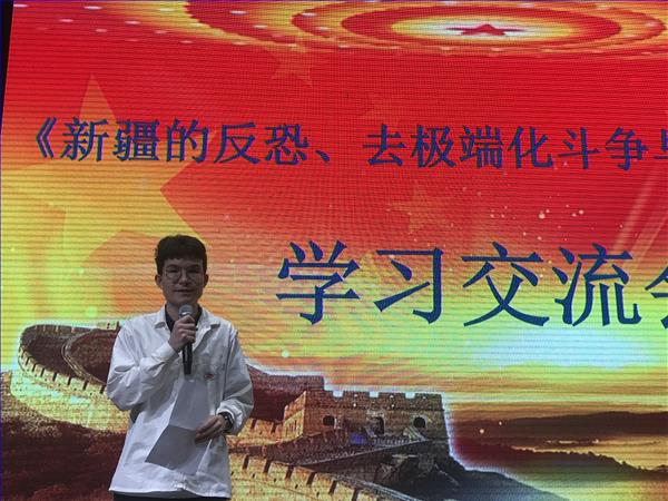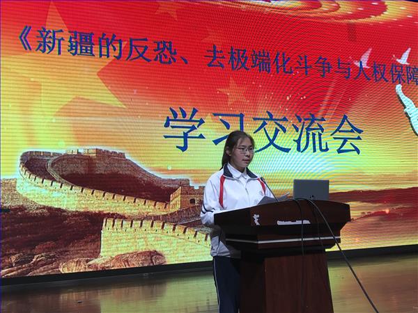 之后,每位同学结合学习材料,撰写了学习活动体会。4月26日,《新疆的反恐去极端化斗争与人权保障》学习交流会在夏虹楼音乐厅举行。交流会上,预高1班哈拉哈提同学强调内地高中班学子作为新疆未来的建设者应该承担起一份责任,提高自我素质和辨别是非的能力;高一14班的阿合勒开同学由七五事件说起举了跳舞女孩的例子,强调了只有团结才能稳定、只有稳定才能更团结;高二13班任怡丞同学强调在新疆去极端化的路上没有一个人能够置身事外……演讲中,同学们呼吁大家一起行动,带动身边的人捍卫民族团结,坚定自己的立场,与极端主义做斗争。