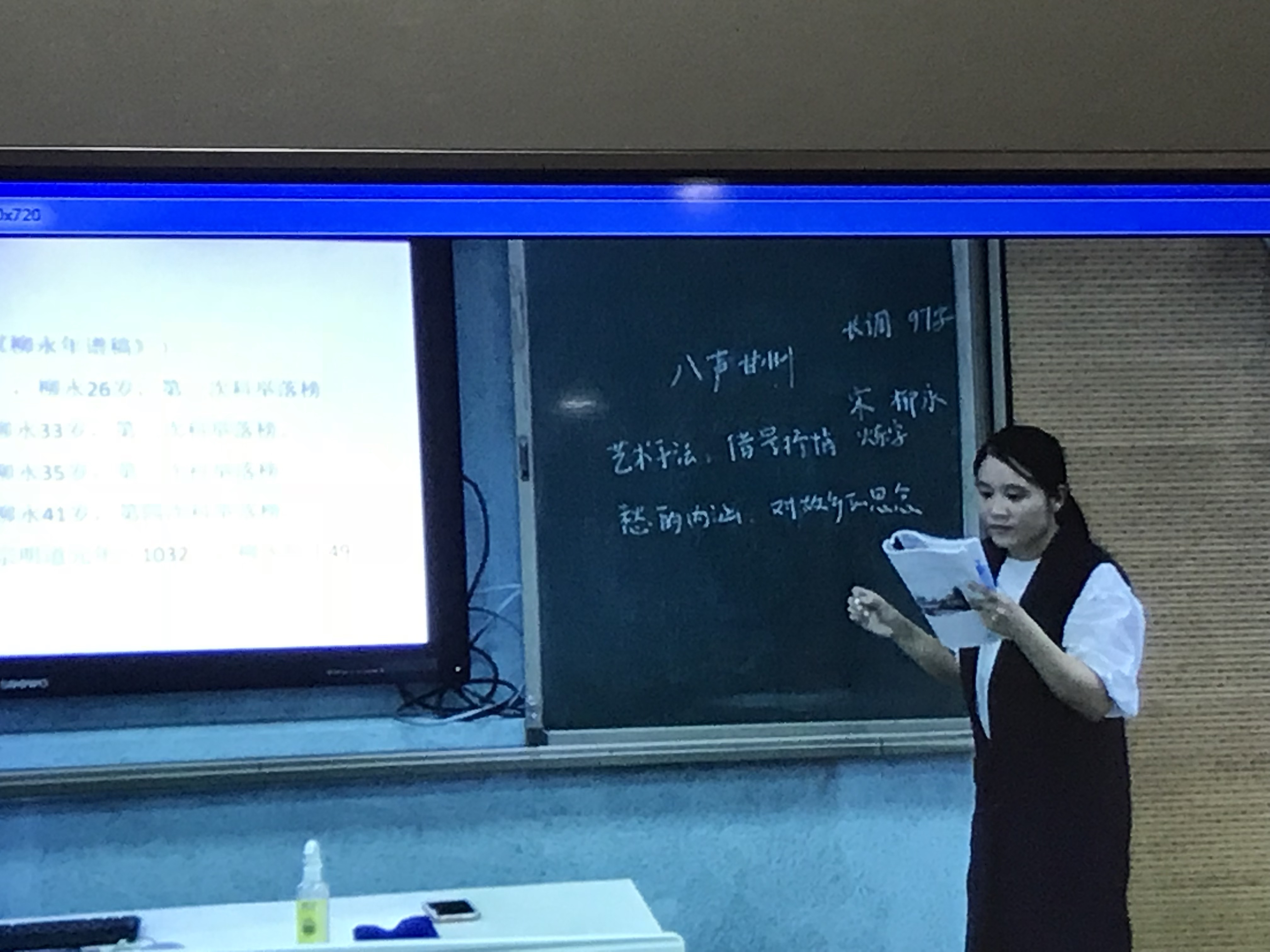 在学生齐声朗诵全词后,陆老师又补充介绍了婉约词的概念,帮助学生感受柳永词委婉流转的特点。至此基本落实了本课预设的教学目标。