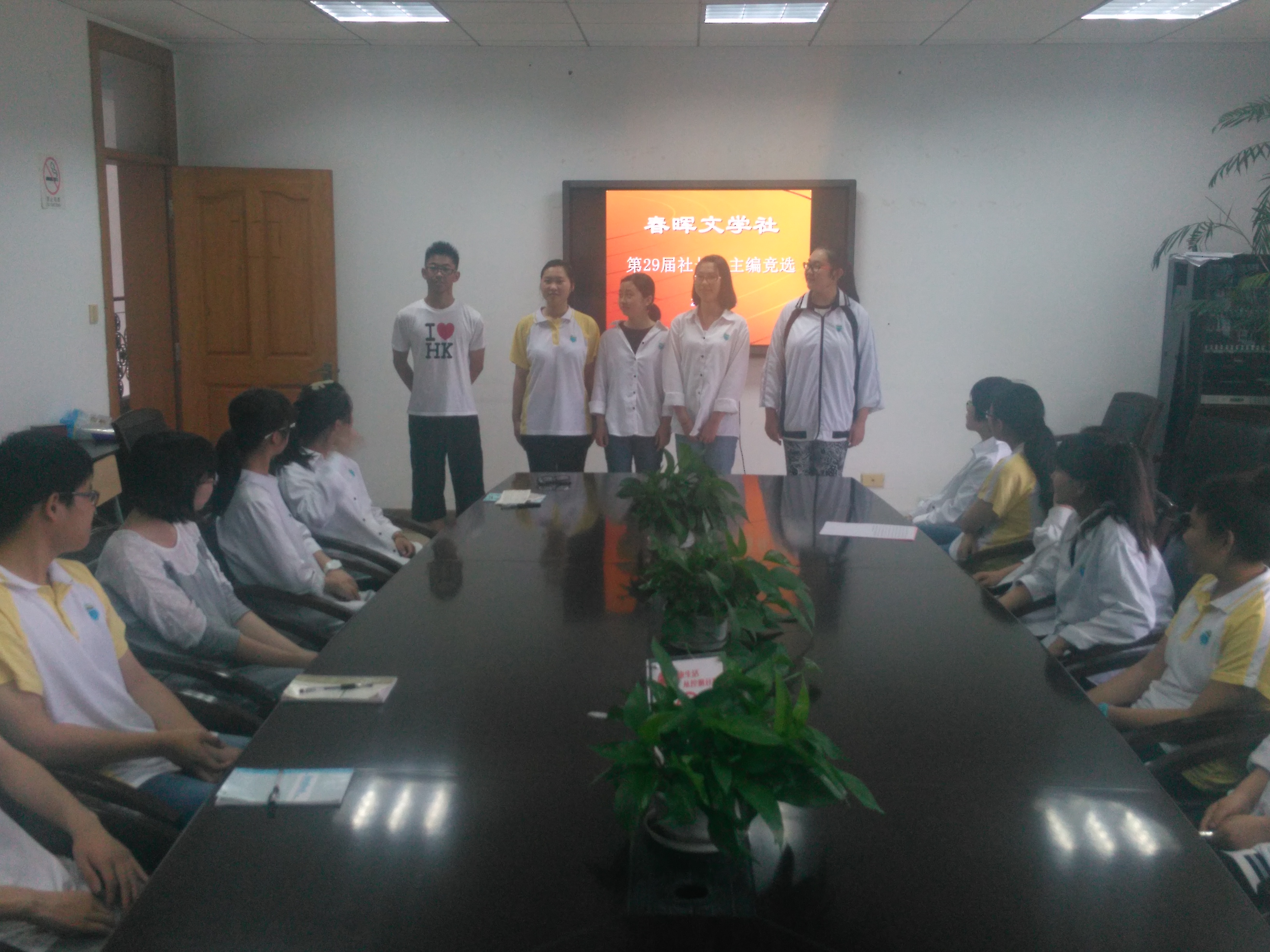 518下午,春晖文学社利用社团活动时间,在学校春韵楼210会议室进行了第29届社长主编竞选活动。期间,有七位社员走到台前,竞选文学社的社长、主编等职务。