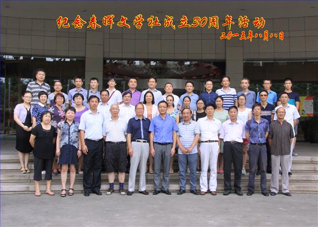2015年8月8日,我校春晖文学社的新老“春晖人”在东方绿洲宾馆,召开了“纪念春晖文学社成立30周年座谈会”。出席座谈会的有复旦大学副校长许征(学姐)、青浦教育局局长程卫国老师、青浦作家协会主席张林根老师,作家戴仁毅老师、书法家陆长晖老师,朱家角中学老校长徐绥琪老师、书记蒋伟勇老师以及春晖文学社历任指导教师和新老社员。