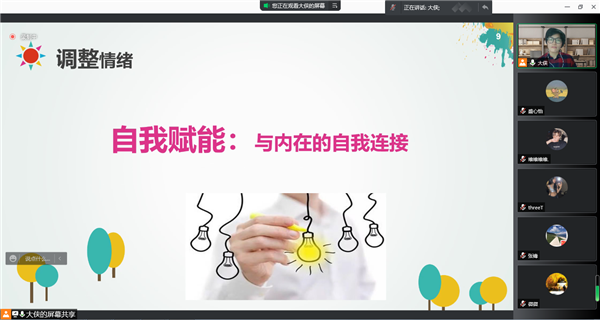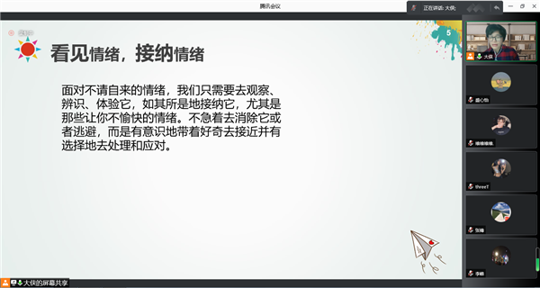 接纳情绪。负性情绪很多时候并非源于情绪本身,而是面对负性情绪人为产生的强烈抗拒与驳斥,明确这一点后,陈老师带领大家闭目冥想,与自己的情绪静心对话、平和相处。