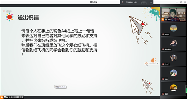 守护情绪。最后环节,陈老师引导同学们看到大疫之下,全国各地支援上海、各行各业守卫上海付出的努力,看到学校为保障大家安全所作周详的布置和无私的付出,班主任、内派老师、校值班老师、心理老师,都是大家的坚强后盾。课之末尾的“纸飞机送祝福”将这份爱与温暖继续传递,小伙伴们纷纷收到祝福。