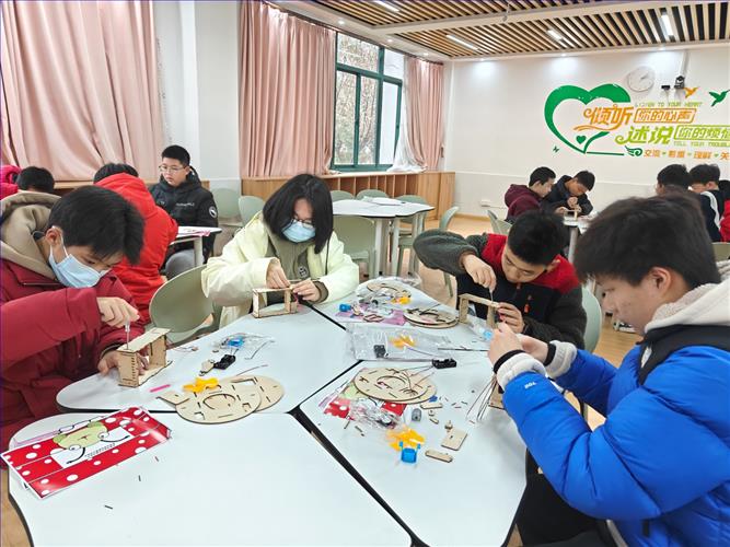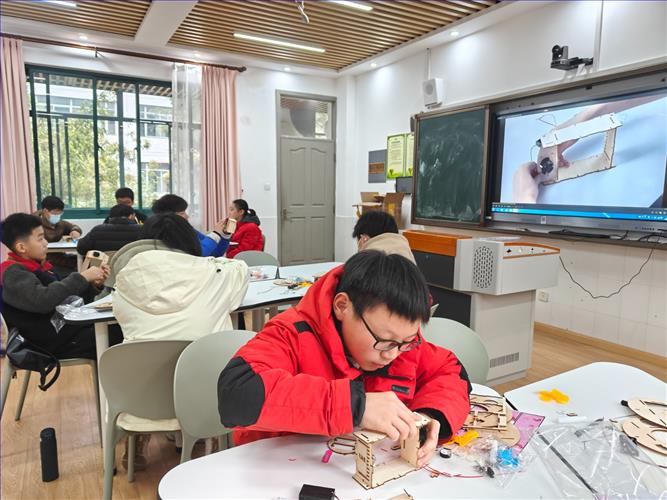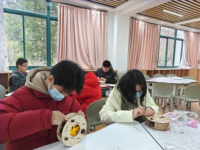 《扫地机器人》是由电机、导线、风扇、车架、顶板等零件组成,其原理是由身体内部风扇旋转带动空气向后流动,产生负压、流入风扇的空气带动灰尘或纸屑进入收集器,达到清洁的功能。同学们都很积极,最终都做成了自己满意的成品。
