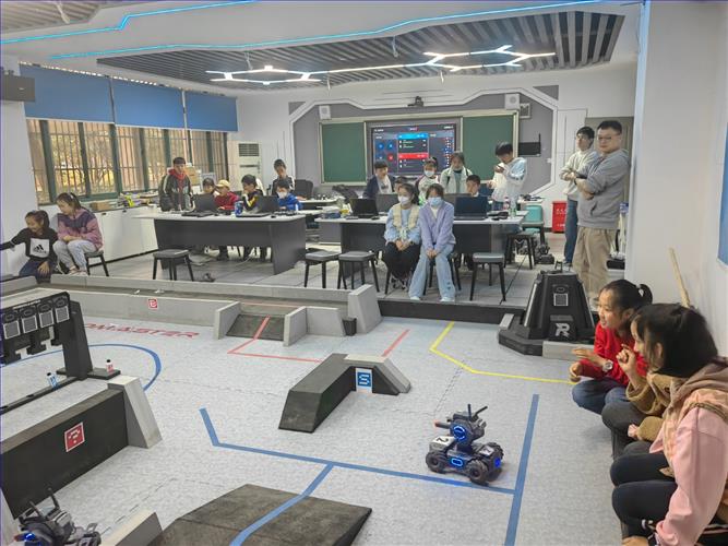 在活动中,学生们积极参与,全身心投入到科技活动中,充分展示了他们对科技的热情。《玩转机甲大师科技共享课程》包括机器人控制和人工智能两部分,旨在提升学生在机器人机械、电子、控制和编程等方面的知识储备量。学生熟悉机甲大师机器人的组成部分、功能特点和操作方法之后,可以进行编程和利用传感器获取环境信息实现各种动作和任务,培养学生的编程思维和逻辑能力。