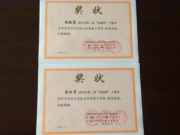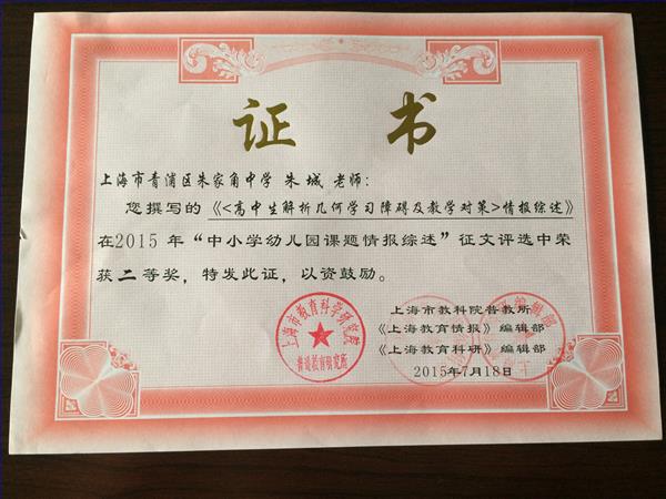 此外,朱城老师的《高中生解析几何学习障碍及教学对策情报综述》获得2015年“中小学幼儿园课题情报综述”征文评选中获得二等奖。张国成老师指导的学生顾敏慧和朱江月分别获得第二届“黄浦杯”上海市中学生学会学习征文比赛三等奖,张国成老师在第二届“黄浦杯”上海市中学生学会学习征文中获指导老师奖。