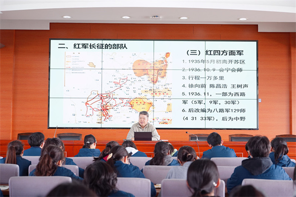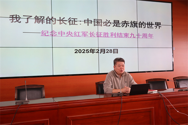 2025年2月28日中午,我校2026届青年党校学生在春韵楼406进行了第四次党课学习,本次党课由我校教育科研和教师发展中心主任张国成老师主讲,他为青年党校学生作了题为《我了解的长征——纪念中央红军长征胜利结束九十周年》的专题党课。学习活动由学校党总支书记吴东林主持。