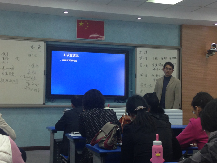 上午,青浦一中王志江老师开课《声声慢》,诵读经典指导。课上王老师主要通过“清句读,读懂内容”讲读《声声慢》。学生初读,但情感没有得到很好的表达。教师指导学生要读出情感,读出快慢强弱,示范之后,学生再读。之后将作品分为六层,分小组讨论怎样读。先文本研读,学生再朗读。最后配乐学生读,教师示范读。整堂课学生参与度高,感情投入,诵读水平迅速提高。展示课结束后,王志江老师进行了“诵读与语文教学”的讲座。首先分析了诵读教学的现状及困境,接着探讨了以情发声的基础——文本解读及诵读,最后,王老师跟与会教师分享了自己对诵读教学的展望。