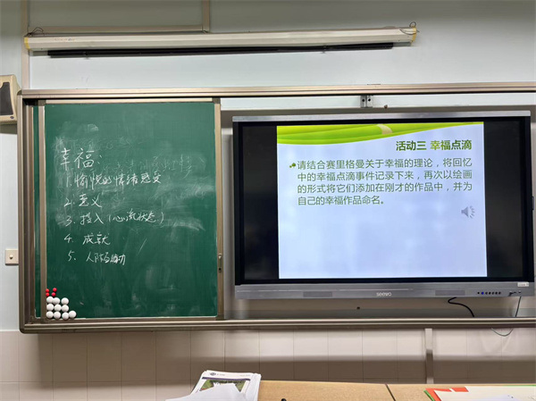 结合塞里格曼的幸福理论,学生在原有画作上添加人生中重要幸福事件的符号,并勾勒对未来幸福场景的期待。活动尾声,多数学生的“幸福打分”较初始值显著提升。