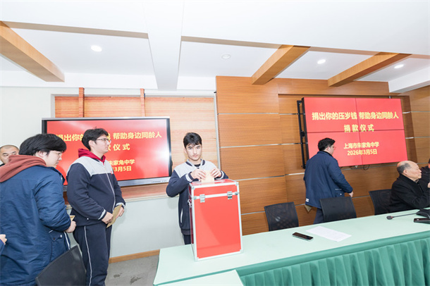 倡议与讲话结束后,捐款环节正式开始。各班班长手持班级同学捐赠的压岁钱,怀着真诚的爱心,依次上台,将凝聚着同学们善意的钱款郑重投入捐款箱。每一笔捐款,都承载着同学们对同龄人的美好祝福;每一个身影,都彰显着新时代青少年的责任与担当。工会主席池坚老师代表教职工捐款,以实际行动传递师者爱心与责任担当。现场秩序井然,温情涌动,掌声不断,每一份善意都在这一刻汇聚成温暖的洪流,定格成校园里最动人的画面。
