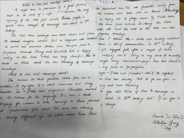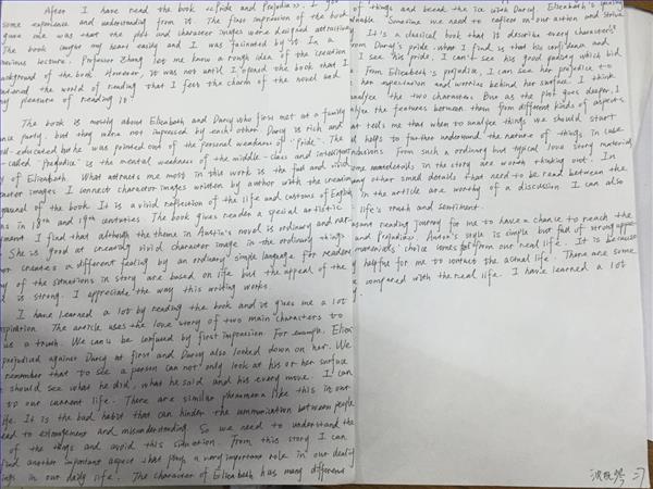 经过一个寒假的阅读,开学初我年级举办了征文比赛初赛,经过班级推荐,层层选拔,共有40名同学的征文进入决赛。有的同学以Elizabeth和Darcy的爱情为主线, 探讨何为正确的爱情观;有的同学将书中3对恋人做对比,分析不同的人物性格的不同命运;有的同学以Elizabeth妈妈为切入点,分析书中人物性格特点……经过初赛和复赛,层层选拔,最终有39名同学在这次活动中脱颖而出!其中一等奖3人,二等奖5人,三等奖9人,优胜奖22人。