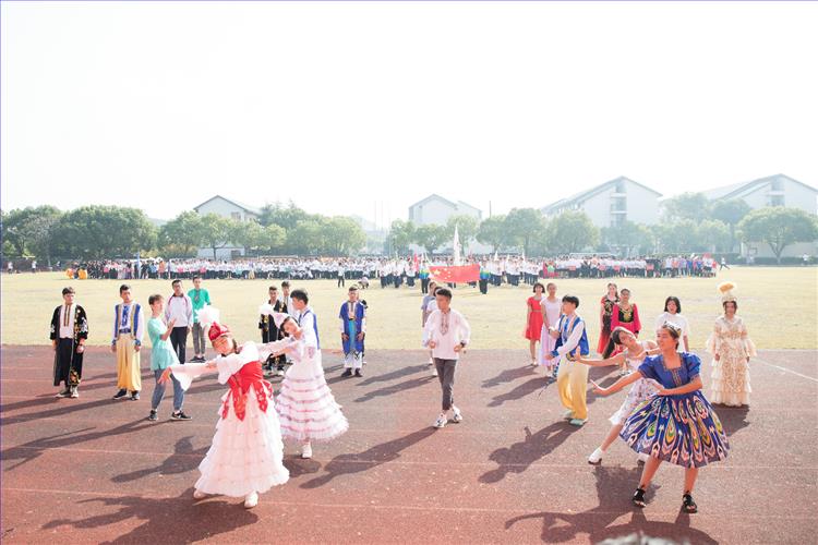 本届运动会开幕式上每个班级进行了入场展示,随后新疆班同学进行了萨马舞的表演,舞狮队也第一次亮相,最精彩的是高一全体同学和老师一起参与的大型舞蹈《红旗颂》,全校师生共同演唱了《我和我的祖国》。