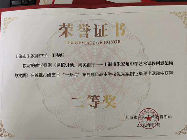 同时,由田春红老师撰写的《上海市朱家角中学合唱一条龙项目建设研究》《课植引领、向美而行——朱中艺术课程创意架构与实践》分别获得首批市级艺术“一条龙”布局项目高中学校优秀案列征集评比二等奖。