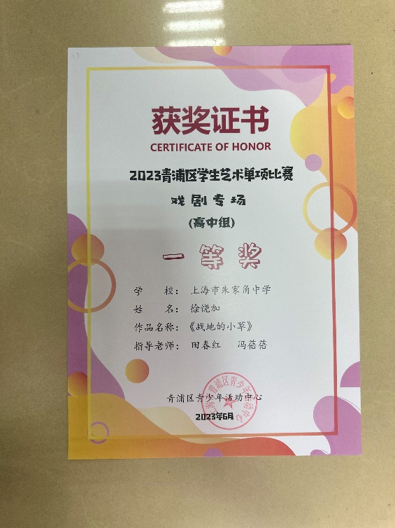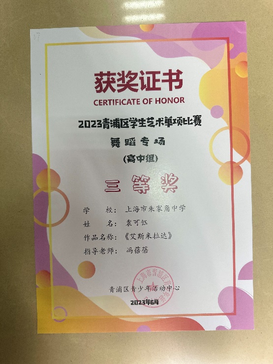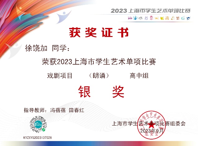 其中高三2班徐饶加、高二14班阿依布兰·阿迪木拉提同学代表青浦区参加上海市学生单项比赛决赛分别获得银奖和铜奖。